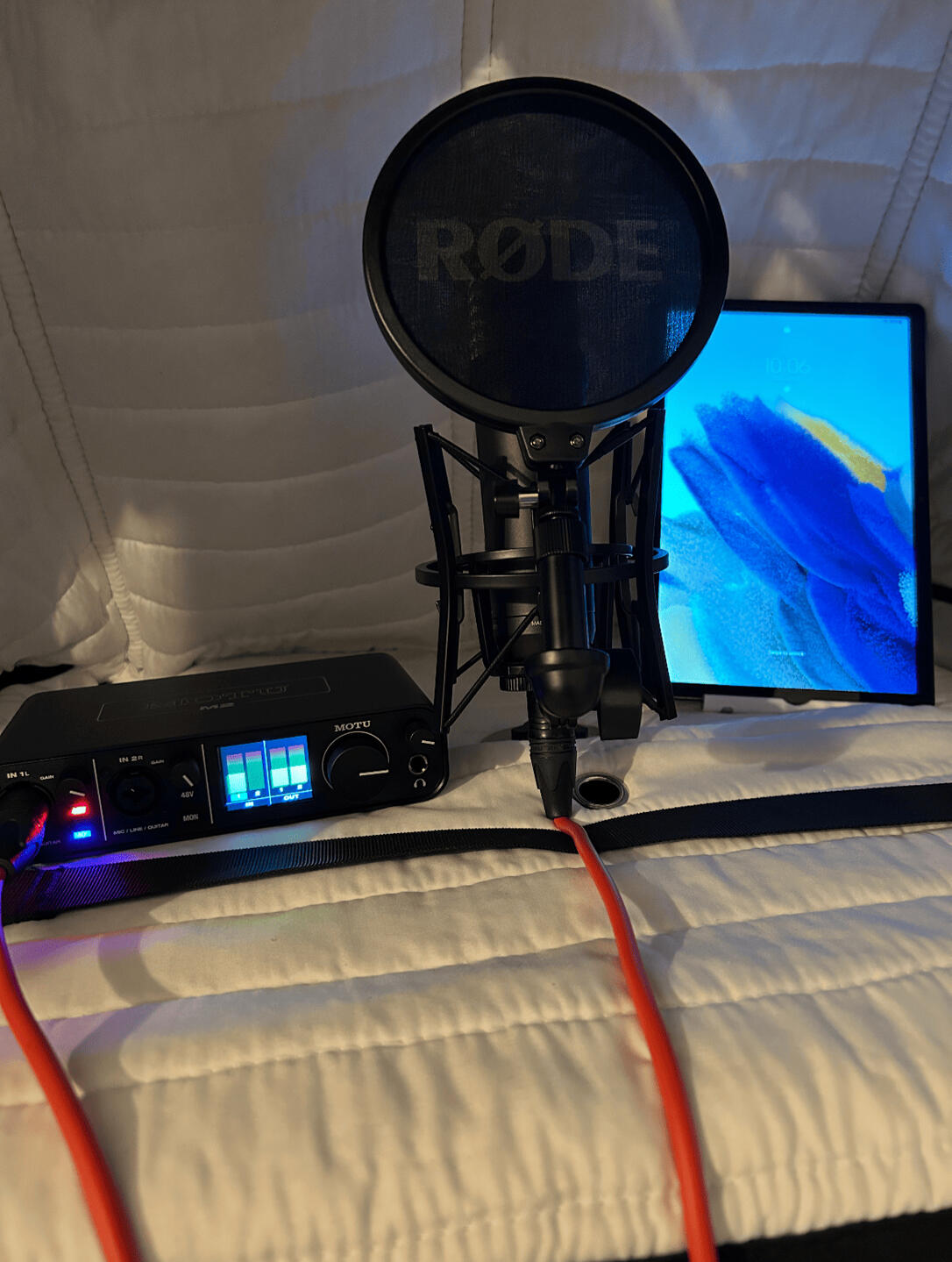 * Microphone: Rode NT1 Condenser* Interface: MOTU M2* DAW: Audacity* Booth: VOMO from VocalBoothToGo